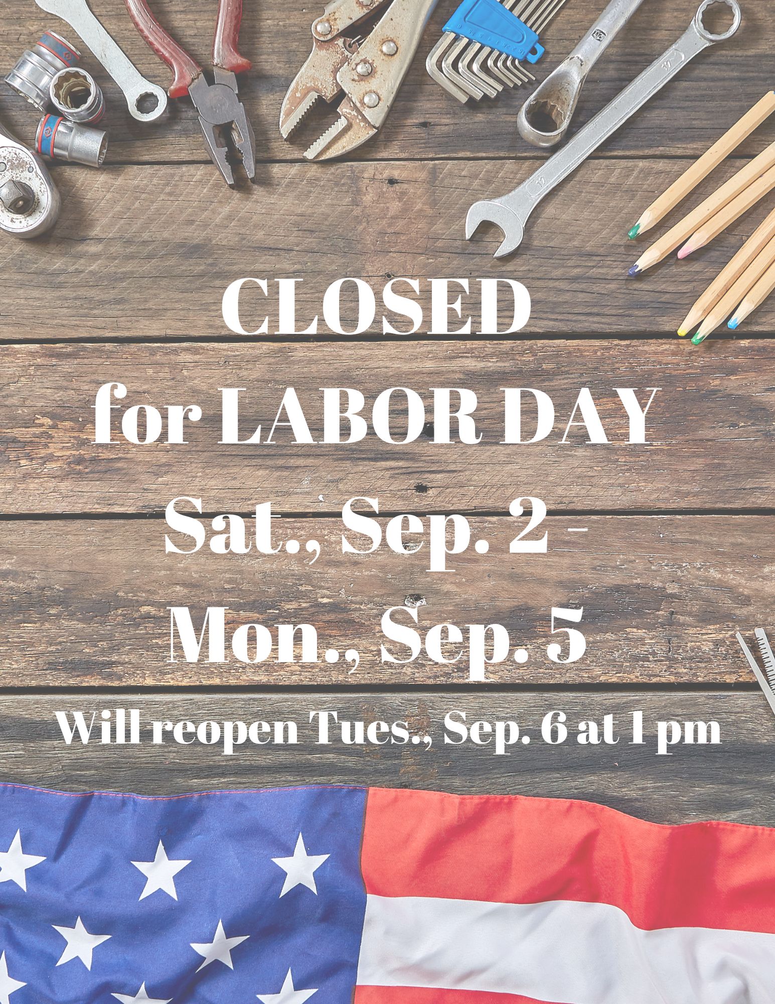 CLOSED for LABOR DAY Sat., Sep. 2 – Mon., Sep. 5 Published August 22, 2022 at 1545 × 2000 in CLOSED for LABOR DAY Sat., Sep. 2 – Mon., Sep. 5 ← Previous Next →